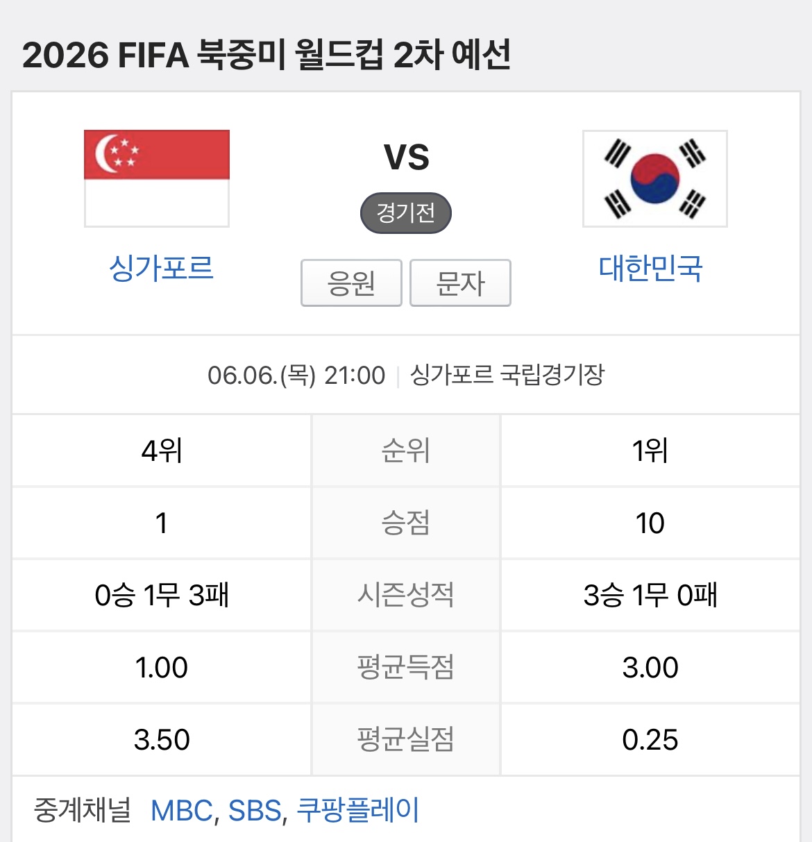 드디어 오늘 2026 FIFA 월드컵 아시아 2차 예선 경기가 열립니다. 아직 중계 채널 선택을 하지 못하셨다면 빠르게 정보 확인 하시고 우리나라 국가대표팀 선수들을 응원해 주시기 바랍니다.