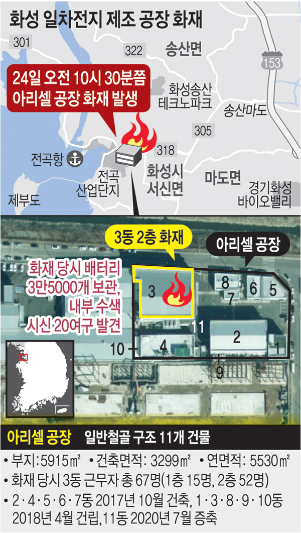 23명의 사망자가 발생한 경기도 화성 일차전지 제조공장 화재 현장에서 밝혀진 바에 따르면 배터리에서 연기가 발생하자 근무자들이 소화기로 진화를 시도했지만 불과 1분이 채 지나기도 전에 연이은 폭발로 피해가 컸던 것으로 밝혀졌다.